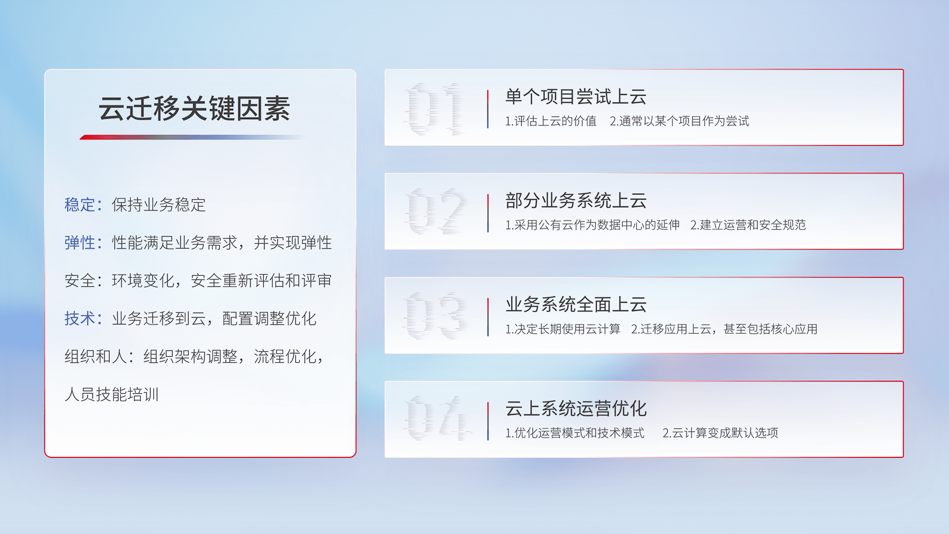结合实际业务,,,从规划设计、、、云平台选型、、云原生改造、、、数据迁移、、、集成交付,,,迁移全过程为客户识别最佳上云路径,,做好风险识别管理,,设计网络架构、、身份权限、、、、安全审计合规、、操作审计、、、、日志审计、、、、监控告警策略、、、、多站点容灾设计等,,,,对云上基础设施进行整体规划,,,,提升IT治理水平,,,以满足弹性、、、高可用、、高性能的需求。。