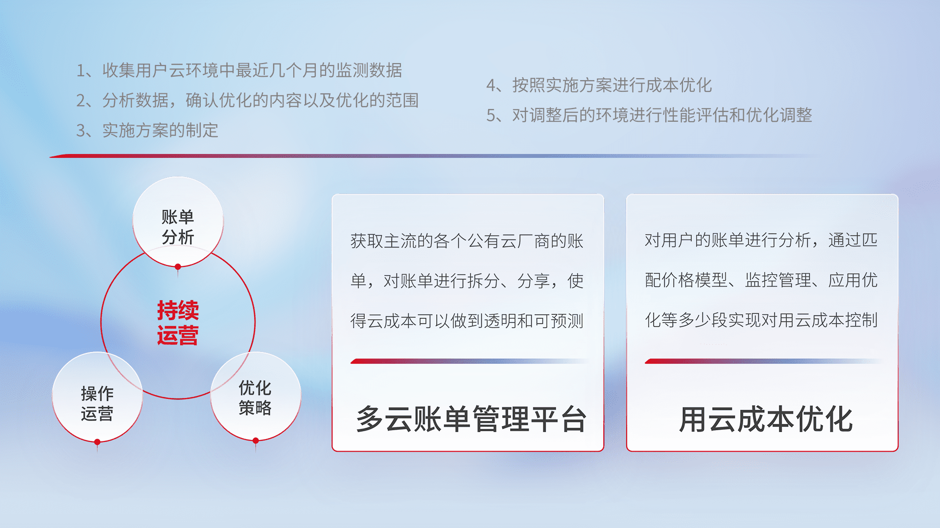 通过多云纳管,,以统一的资源数据模型把客户的云资源进行抽象和封装,,,,进而实现对多云资源的统一操作,,,,保障云资源管理的可靠性、、稳定性与可用性。。量身定制化运维内容,,,配置、、、开发运维、、、、补丁管理、、备份、、、监控、、、、认证和访问管理、、、、审计和日常巡检等,,保障在用云过程中的可靠度,,,稳定度以及高可用率。。。。